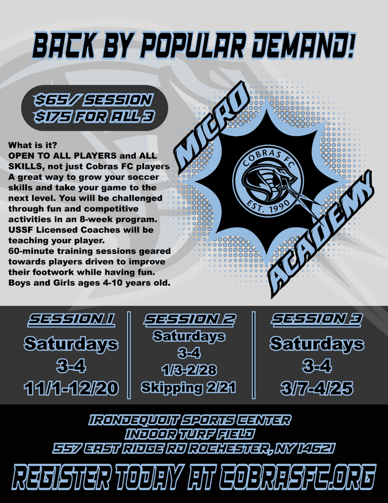 Welcome to Cobras FC , Rochester New York's premier destination for youth soccer.